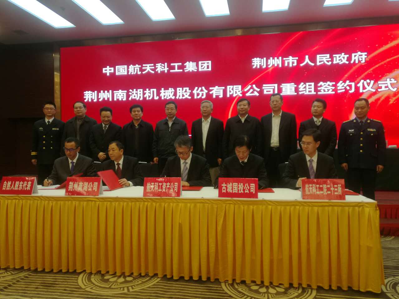 2016年11月25日,航天科工资产管理有限公司(以下简称“资产公司”)为二院二十三所过桥并购的荆州南湖机械股份有限公司项目在荆州市正式签约。资产公司董事长伍青、二院副院长朱弘、荆州市委书记李新华、市长杨智出席了签约仪式。