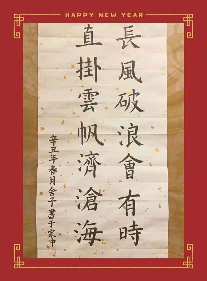 赤青交错,蝴蝶翩飞,金穗飘洒,春日暖阳下盛开的花枝,即是一直以来我对美好事物的认知体现。赤色的奔放、沉稳与青色的低调、沉闷迸发强烈对比,实又相得益彰。将此愿景泼墨于挂历之上,悬置在家中显眼处,在新的一年里,时刻体味这新春伊始对自己和家人的美好期许与祝福。 同时也不断提醒自己,先物而动,先事而应,对工作和生活坚持不懈、积极乐观, 终将破茧化蝶。