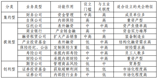 按照金融机构的业务类型、功能作用,可以将央企金融平台划分为集约型、提效型和创利型三类。