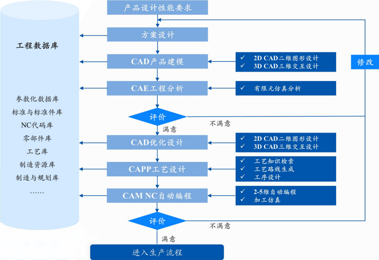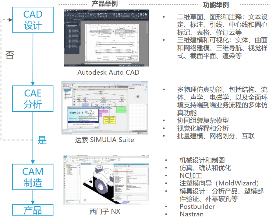 在技术层面上,CAD和CAE是两大技术方向,CAD的核心是基于集合模型的造型建模,CAE是基于物理模型的数值拟合求解,而CAM是将CAD建模转化为数控加工程序的功能。在应用层面上,CAD、CAE、CAM三者环环相扣,由CAE软件读取CAD的初步建模,进行工程分析(仿真模拟),再将结果反馈给CAD继续优化产品设计,最后由CAM进行自动化数控编程。流程结束后与生产管控和管理运营软件结合起来进行生产作业,由生产制造系统进行加工制造。