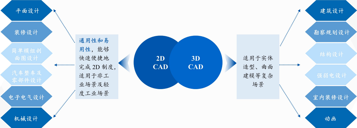 CAD是指利用计算机及其图形设备帮助设计人员进行虚拟设计的软件。企业研发部门接到订单后进行需求分析(GA)、需求工程(GE),使用CAD软件进行几何建模设计,如二维绘图、详细绘制、设计文档和基本三维设计等。CAD/CAM是现代工业控制的三大支柱(PLC、机器人和CAD/CAM)之一。目前主流产品分为2D CAD和3D CAD,3D确较2D更复杂,但两者各具优势。