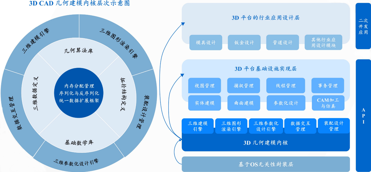 几何建模内核是3D CAD软件的核心基础,决定着软件的能力边界(几何造型能力和几何对象处理能力)和行业扩展性。几何建模内核是将几何物体表达为计算机语言并处理的技术,它是CAD的底层技术支持,提供了约束建模、参数建模、驱动建模等各种底层机制,方便了上层CAD应用的开发。几何建模内核涉及的内容丰富,对稳定性、可靠性要求较高,需要经过大规模、多场景应用迭代以及长期技术积累,才能形成较为成熟的产品。