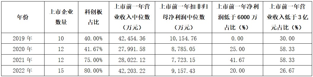 2022年完成上市的公司中有3家扣非归母净利润在6,000万以下,为晶品特装、邦彦技术、隆达股份,上市板块均为科创板,数量比2021年减少两家。