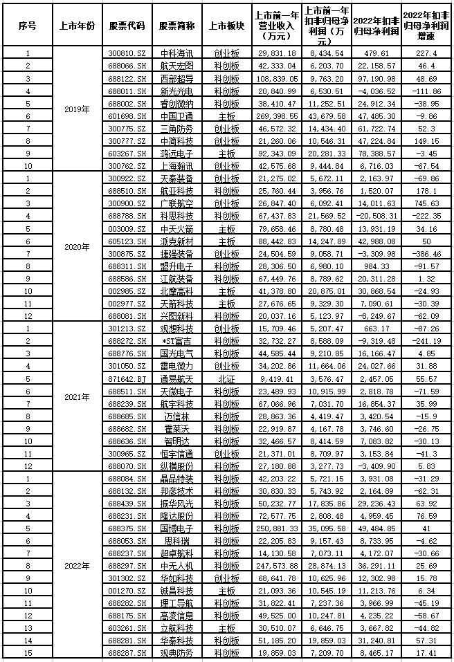 总体来看,2019-2022年完成上市的国防军工企业共有49家,有6家2022年扣非归母净利润为负,占比12.24%;有26家2022年扣非归母净利润低于上市前一年,占比53.06%。