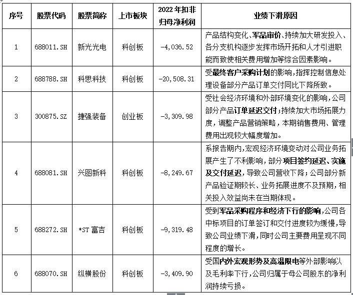 除了富吉瑞,还有多家在2019-2021年完成上市的军工企业在2022年归母净利润为负,包括2019年科创板上市的新光光电;2020年科创板上市的科思科技、创业板上市的捷强装备、科创板上市的兴图新科;2021年科创板上市的富吉瑞和纵横股份。