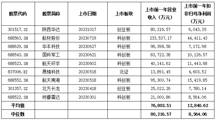 9家公司上市前一年(2022年)平均营业收入为76,803.51万元,平均扣非归母净利润为12,840.62 万元;营业收入中位数为80,216.57万元,扣非归母净利润中位数为8,564.06 万元。营业收入的平均值和中位数均达到2019年以来最高。