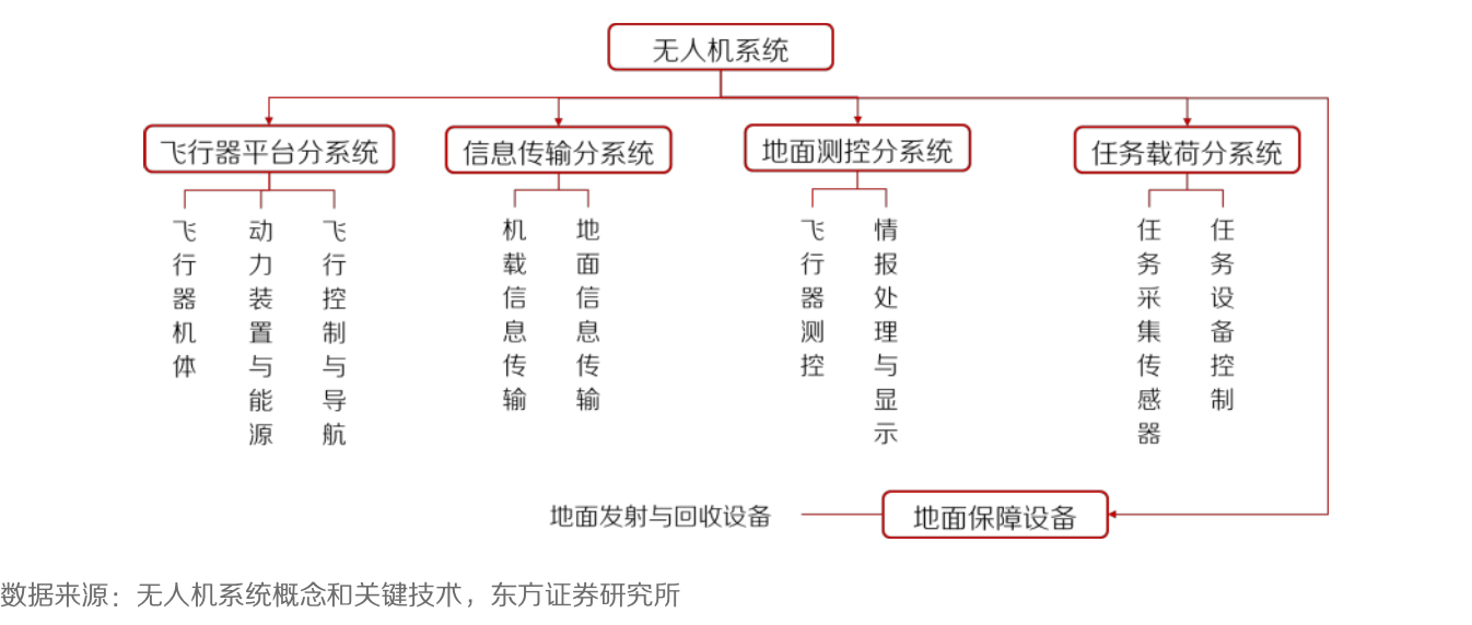 无人机系统(Unmanned Aircraft System,UAS)主要由无人机以及地面控制站等部分组成,是指挥控制站、一架或多架无人机、机载任务载荷、数据链以及相关保障设施共同组成的功能系统。通常由飞行平台系统、任务载荷系统、地面测控系统与综合保障系统构成。